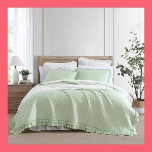 Laura Ashley - 퀸 퀼트 세트, 어울리는 베개 커버가 있는 프리미엄 극세사 침구, 러플 가장자리가 있는 솔리드 다이아몬드 스티치, 세련된 홈 데코 (클레어 러플 그린